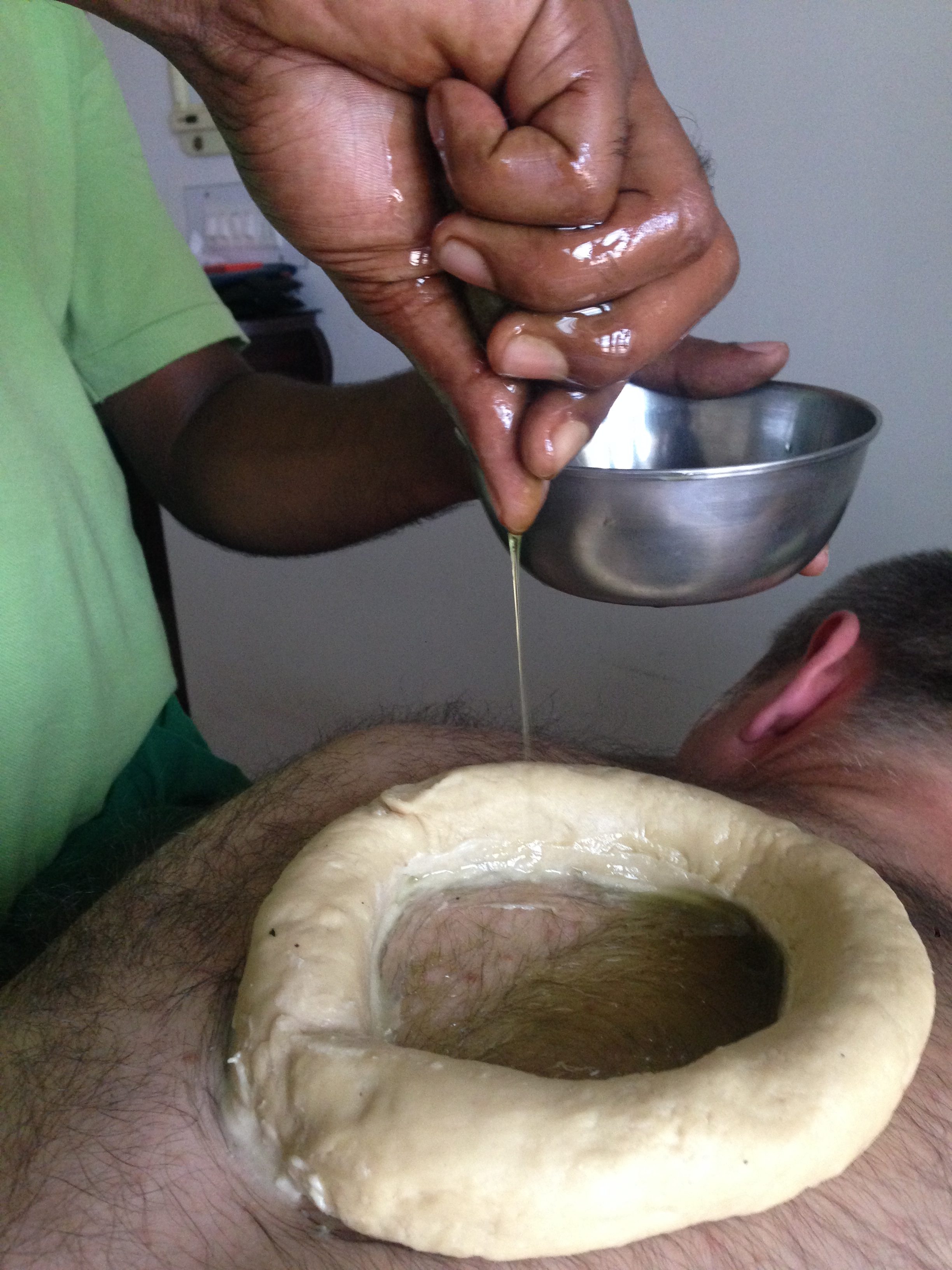 Ein Teigring aus schwarzem Linsenmehl (Urid Dal) wird auf die schmerzende Stelle gesetzt und immer wieder mit lauwarmen, medizinierten Öl gefüllt.